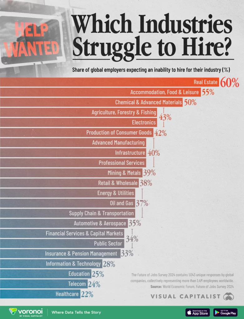 A new chart from Visual Capitalist ranks industries struggling most to hire in 2024.